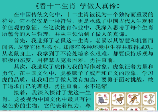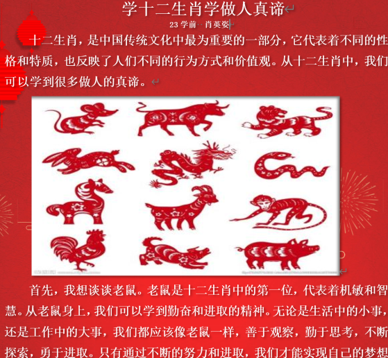 生肖,是中国特有的传统文化符号,是维系中华民族的情感和文化纽带。2024年是农历甲辰龙年,为凝聚广大学子诠释生肖文化,共同营造新春欢乐祥和的节日氛围,坚定文化自信自强,公司党支部积极创意开展了以“探秘十二生肖,传承传统文化“为主题的征文活动,在广大学子中引起极大兴趣和反响,他们纷纷撰写征文,以表达对中国优秀传统文化魅力的向往。